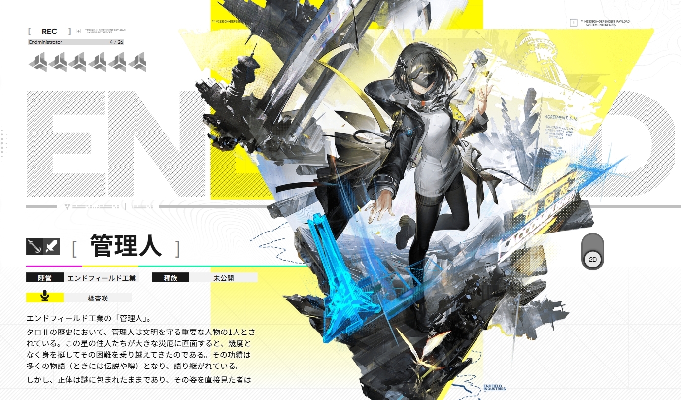 プレイヤーキャラクターである管理人は、エンドフィールド工業の切り札として扱われる最重要機密の存在。10年間のコールドスリープから目覚めた彼女(彼)は、タロⅡの文明を守るべく、個性豊かなオペレーターたちとともに謎多き荒野へと踏み出していきます。