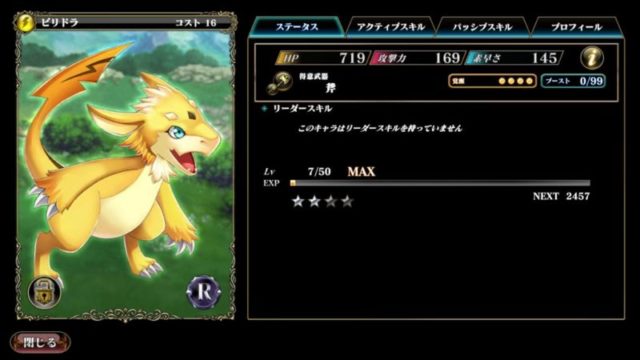 東方湿原「神話の入り口」のポータル近くの草むらで入手できます(場所が少しわかりにくいので注意!)。序盤入手キャラの中では数少ない星4まで進化できるモンスターで、進化後のアクティブスキルとパッシブスキルがどちらも非常に強力。終盤まで活躍し続けてくれるので、時間をかけてでも入手・育成する価値は十分あります。