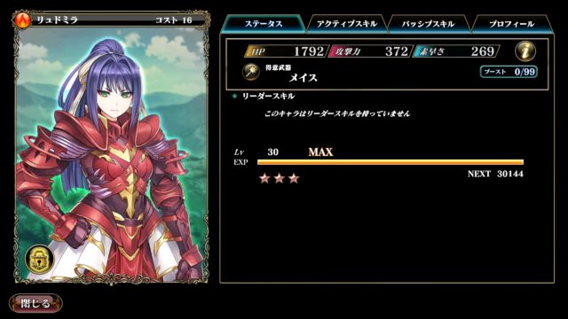 第1章をクリアすると仲間になるキャラクターで、序盤の「守り」を担う存在です。序盤キャラの中でも数少ないブロックスキル持ちで、場に出ているチーム全員を敵の攻撃から守ってくれます。リュドミラが盾役を担っている間に他のキャラクターが攻撃に専念できる——この役割分担が序盤の安定攻略につながります。