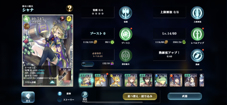 バトルや試練の塔での戦利品回収、ボス討伐などで「経験値コイン」を集めると、プレイヤーレベルが上がります。プレイヤーレベルが上がるほど、キャラや武器の最大所持数・ブースト上限・チーム編成コストの上限が引き上げられ、パーティ全体の戦力が底上げされていきます。