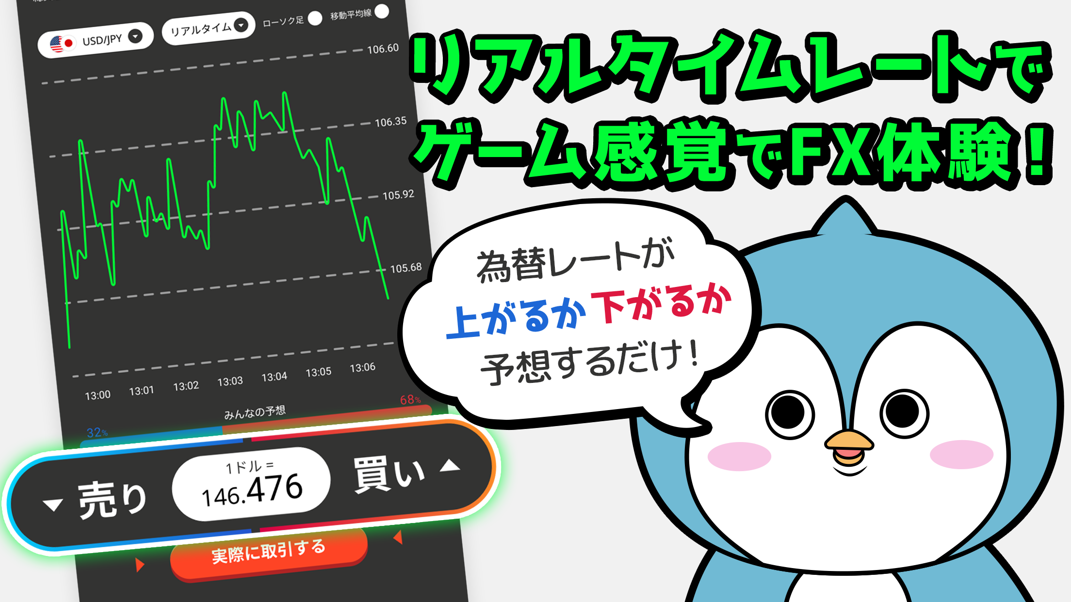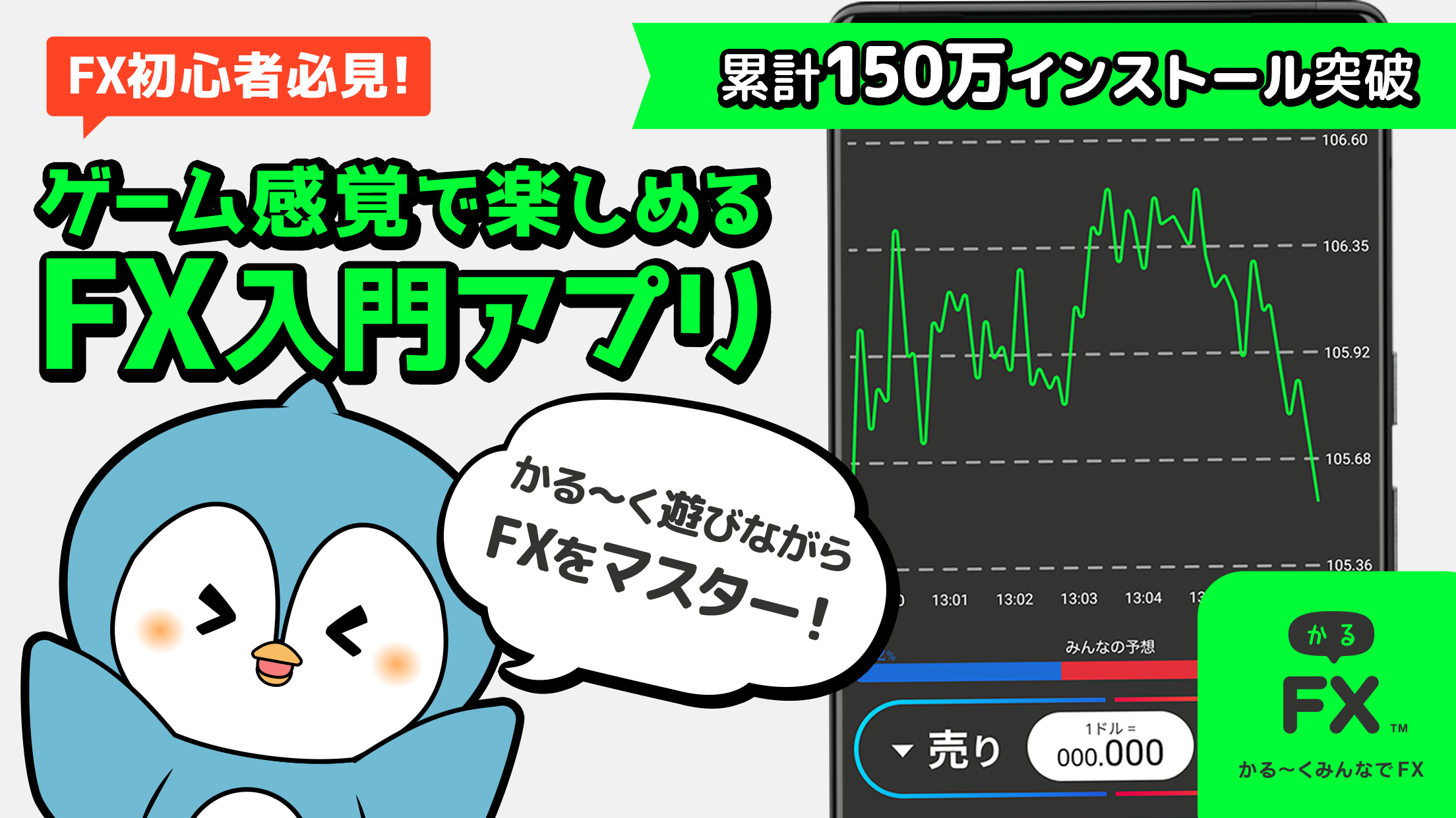 かるFXは、株式会社Finatextが開発・運営するFXデモトレードアプリです。「かるーくみんなでFX」をコンセプトに、FX未経験者でもゲーム感覚で為替の動きを学べる設計になっています。為替レートは時事通信社から提供を受けたリアルタイムデータを使用しており、本番さながらの環境でトレード練習が可能。ただし、デモトレードアプリのため実際の取引・損益のやり取りは一切発生しません。