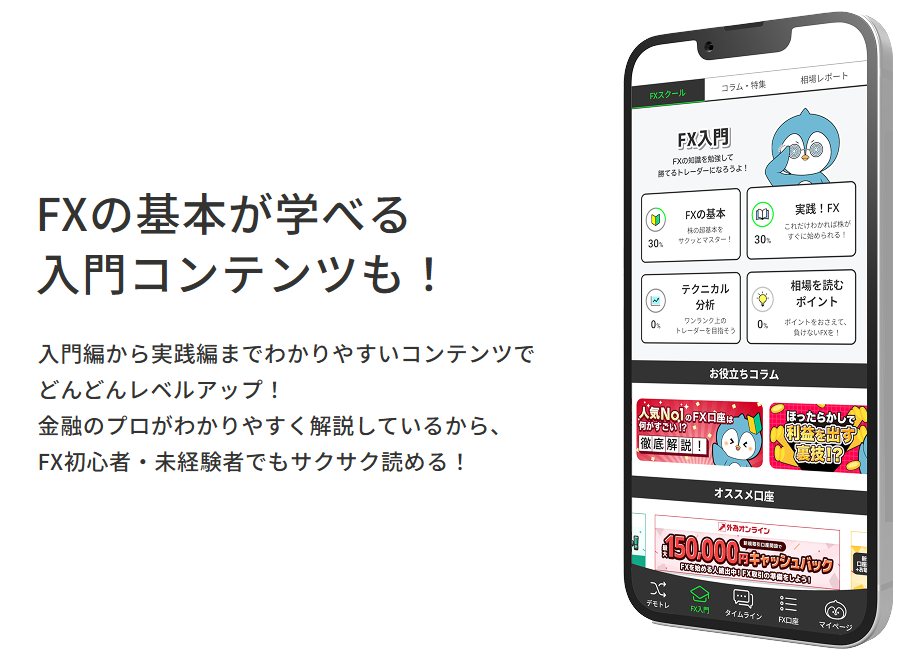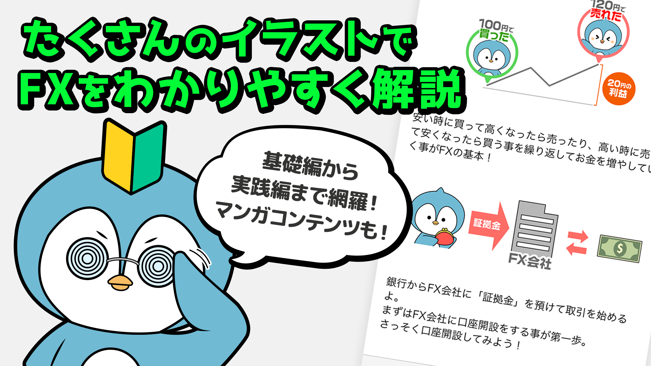 アプリ内の「かるFXスクール」では、FXの基礎知識から実践的な取引テクニックまでを段階的に学べるコンテンツが揃っています。会話形式で展開されるFX入門講座は、FX初心者にとって特に読みやすい設計になっており、専門書を読むような堅苦しさがありません。