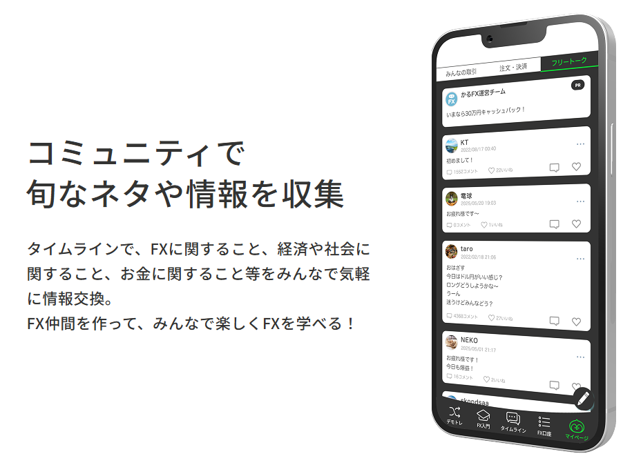FX関連のアプリはいくつか存在しますが、かるFXが特に際立っているのは「デモトレード × 学習 × コミュニティ」を1つのアプリにまとめている点です。
