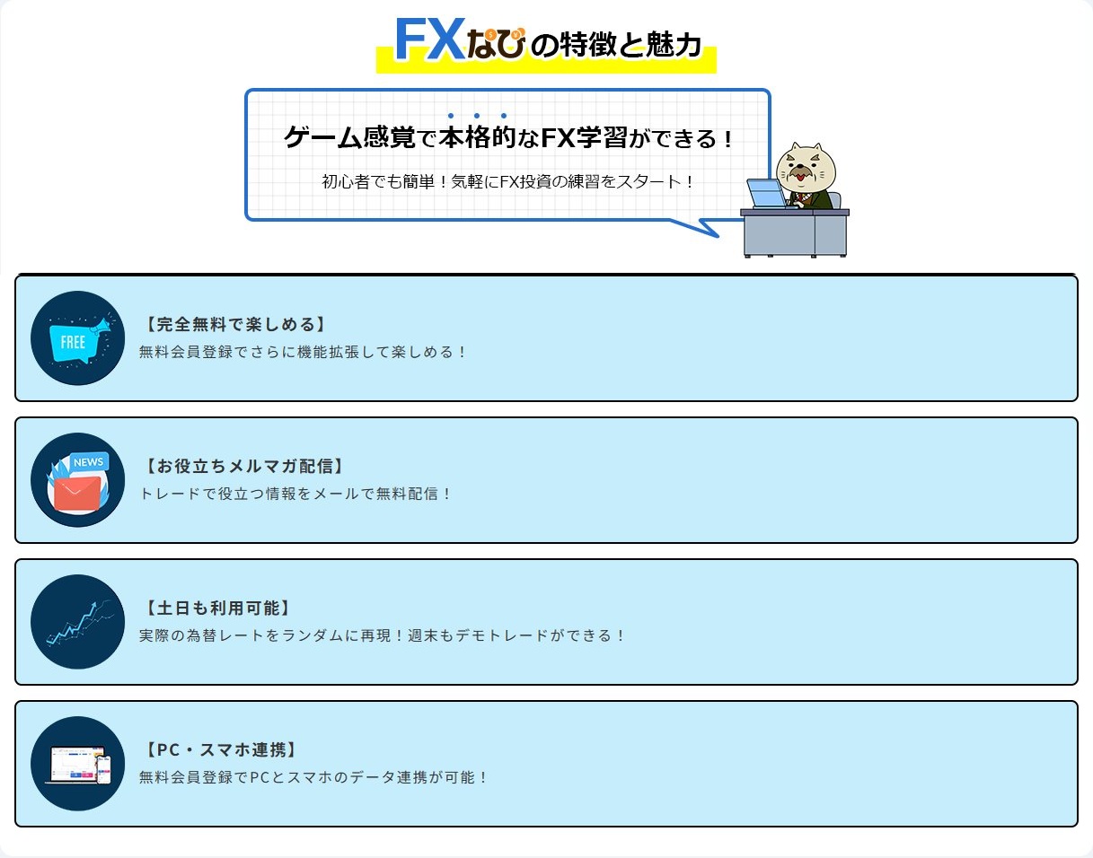 FXのデモトレードができるサービスは他にもありますが、FXなびが選ばれる理由はその手軽さと学習コンテンツの充実度にあります。