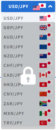 取扱通貨ペアは全部で12種類。最初から使えるのは米ドル/円のみで、その他の通貨はレベルに応じてアンロックされていく仕組みです。メルマガ登録でアンロックできる通貨もあり、段階的に使える通貨を増やしていけます。