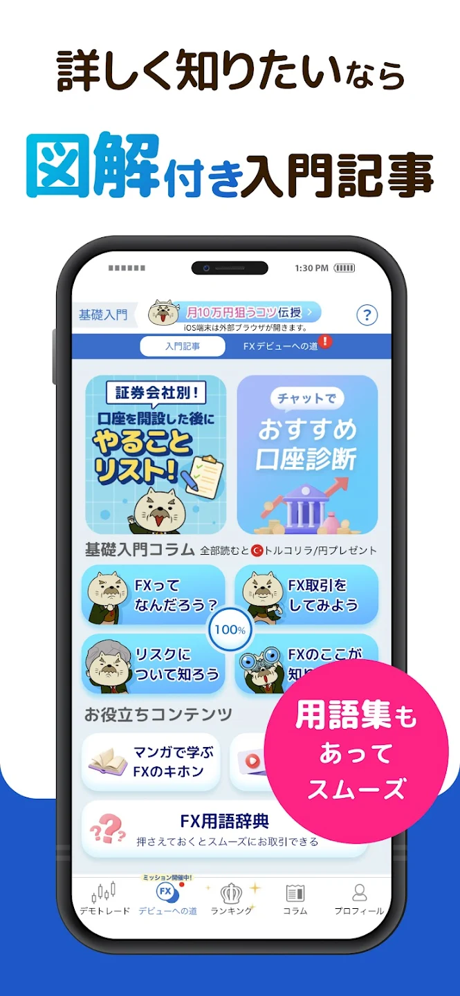 本格的なデモトレードをリスクゼロで体験できるだけでなく、まんが・動画・テキストを使ったFX入門コンテンツも充実💡