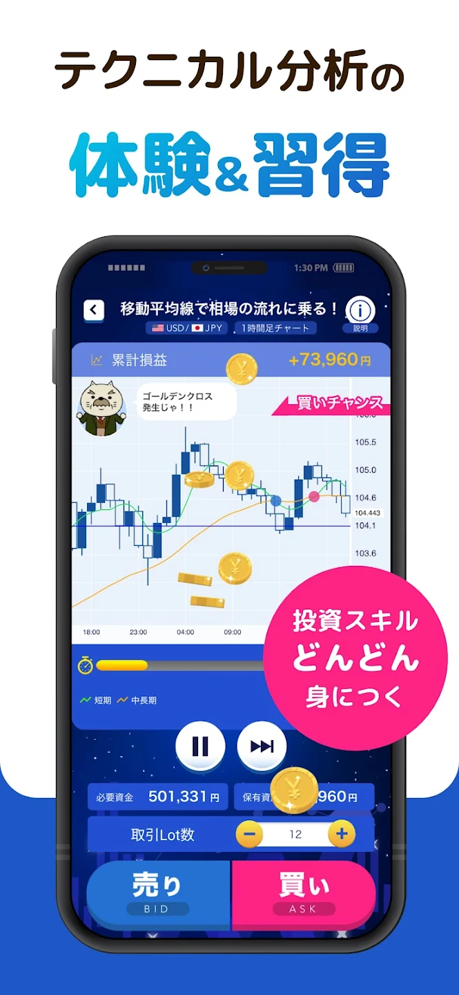 損益はすべて仮想の数字で、実際のお金は1円も動かないので、安心して何度でもトライできますよ!