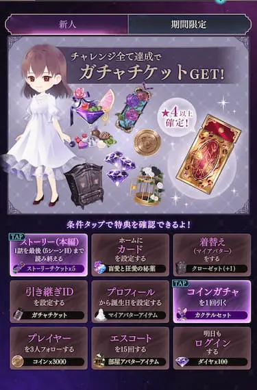 ・アバターガチャ:主人公の衣装などが入手できる。1回300ダイヤ、10連3000ダイヤ