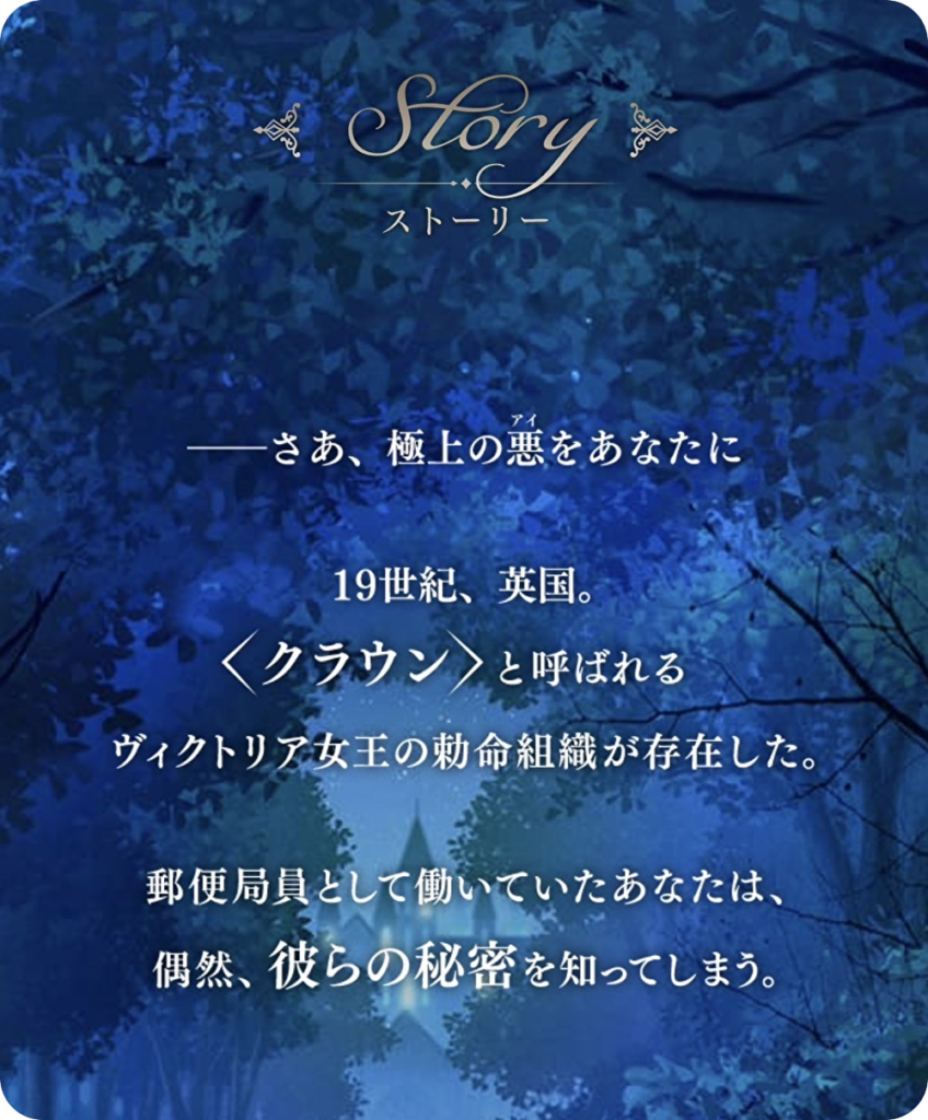 そこで出会ったのは、ヴィクトリア女王の勅命を受けた謎の組織「クラウン」に所属する、9人の見目麗しいヴィランたち。秘密を知ってしまった主人公が死を免れるために提示された条件は、1ヶ月間彼らのアジトに住み込み、「おとぎ師」として彼らの悪行を記録すること——。