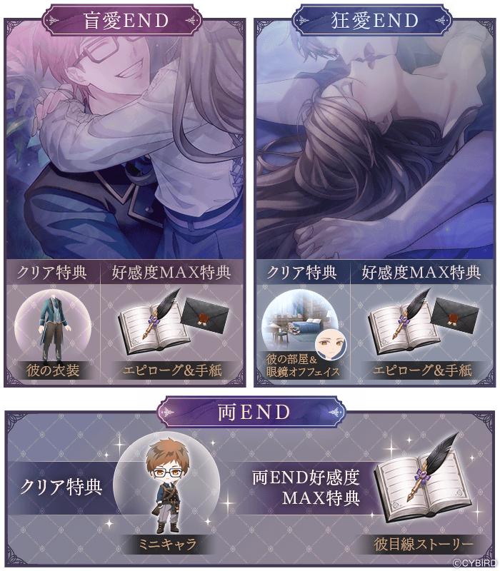 ストーリー中に登場する選択肢によって、キャラクターとの間に生まれる感情の種類が変化します。「盲愛度」と「狂愛度」のどちらが高い状態でエンディングを迎えるかによって、専用のエピローグが解放される仕組みです。