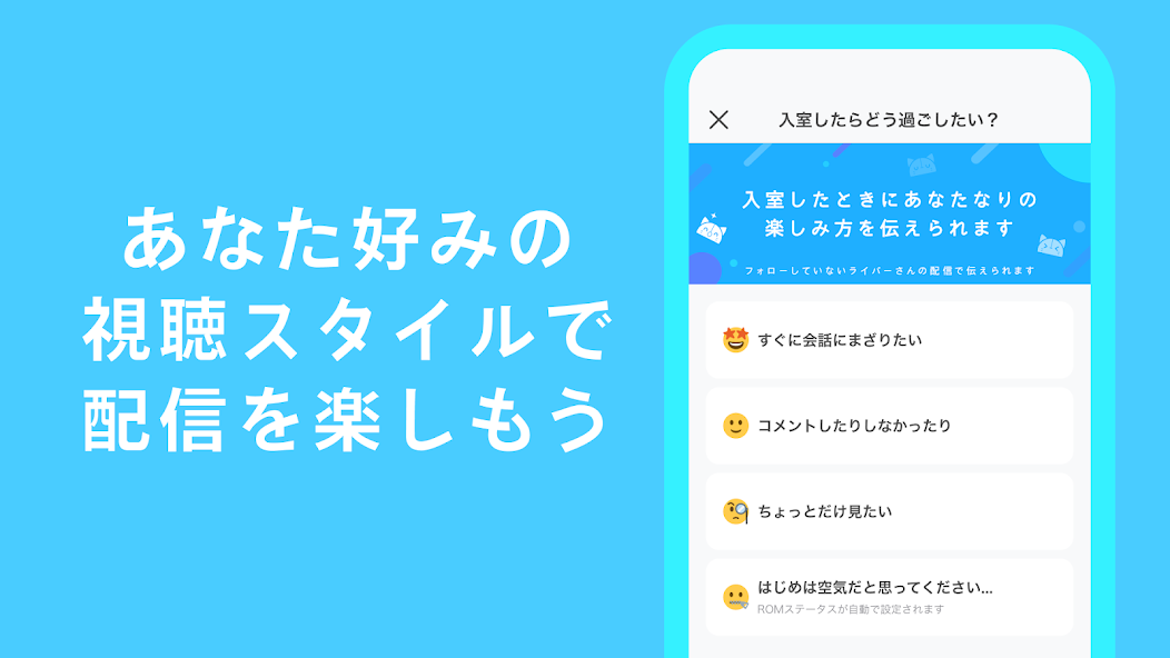 初めての配信に入室するハードルを下げる工夫で、新規ユーザーがライバーと出会いやすくなっています。