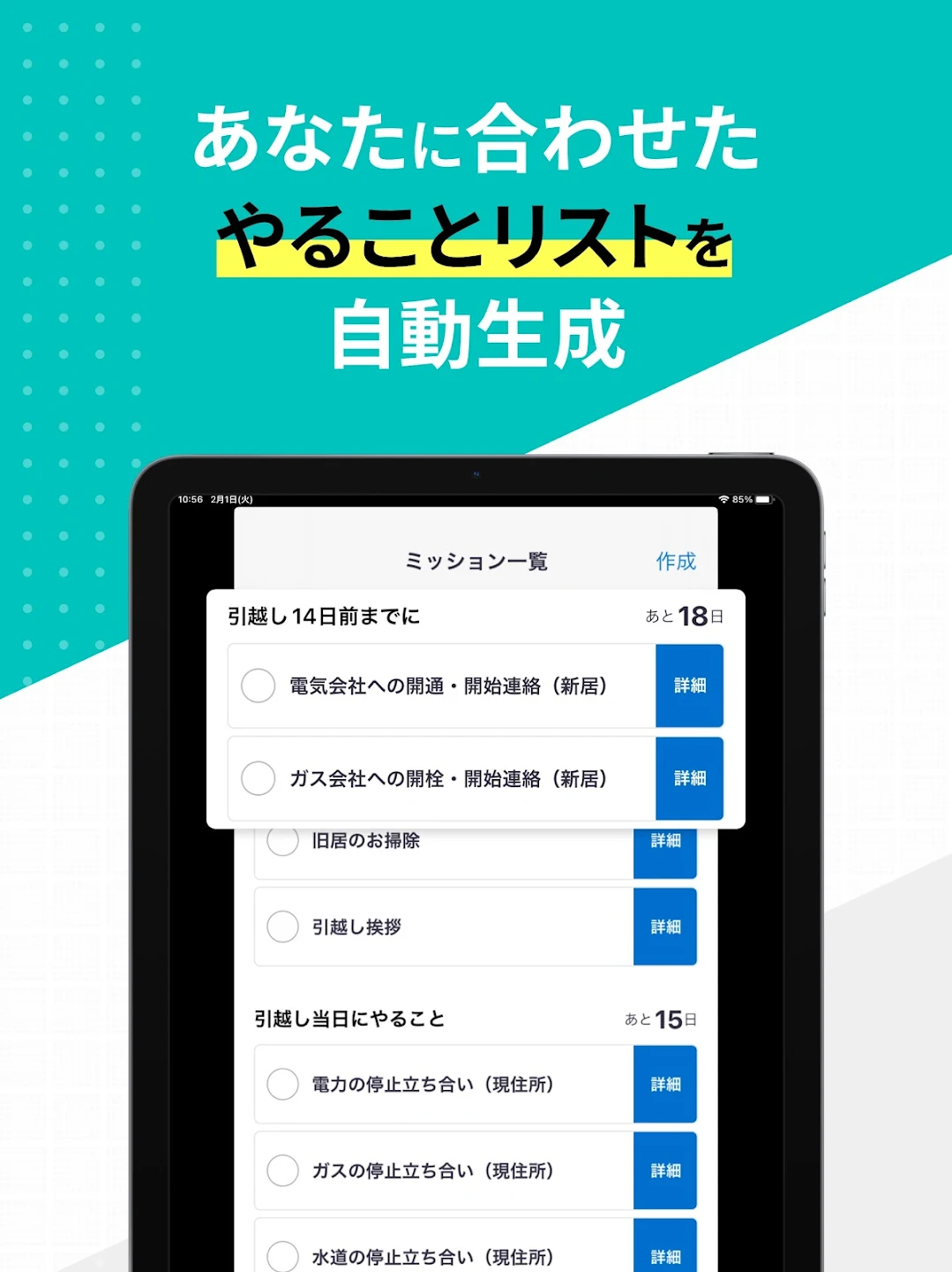 「何をすればいいかわからない」状態から、「あとはリストをこなすだけ」という状態にすぐ切り替えられるのが大きな魅力。引越しに不慣れな人でも、抜け漏れなく準備を進められる安心感があります。
