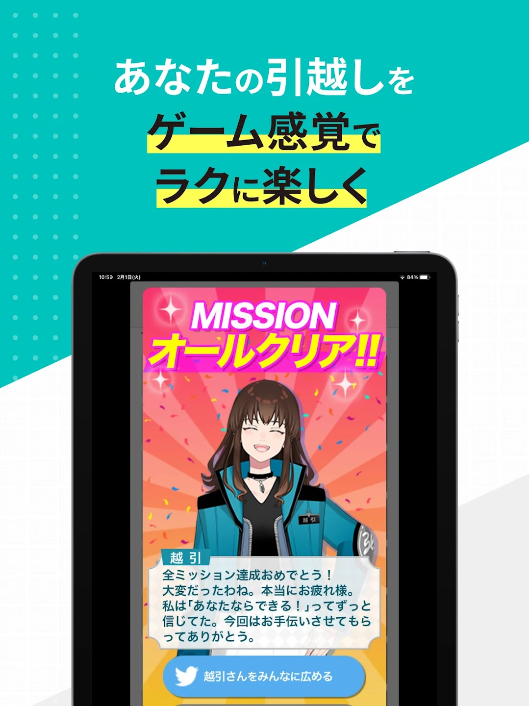 らくらくMOVINGでは、引越しのやることを「ミッション」として管理できます。キャラクター「越引さん」がサポートしてくれる仕掛けで、タスクをひとつ完了するたびにクリアの達成感が味わえる設計になっています。