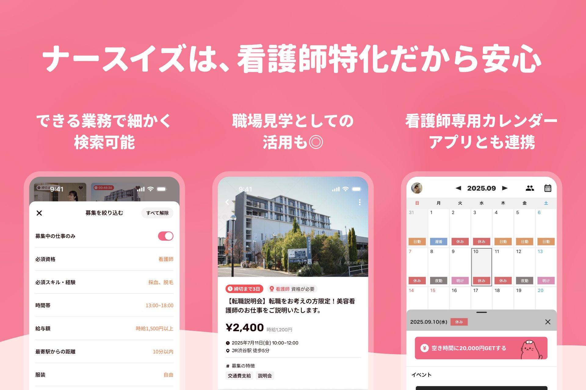 ナースイズは看護師の資格を持つ人だけを対象にした専門特化型のアプリです。