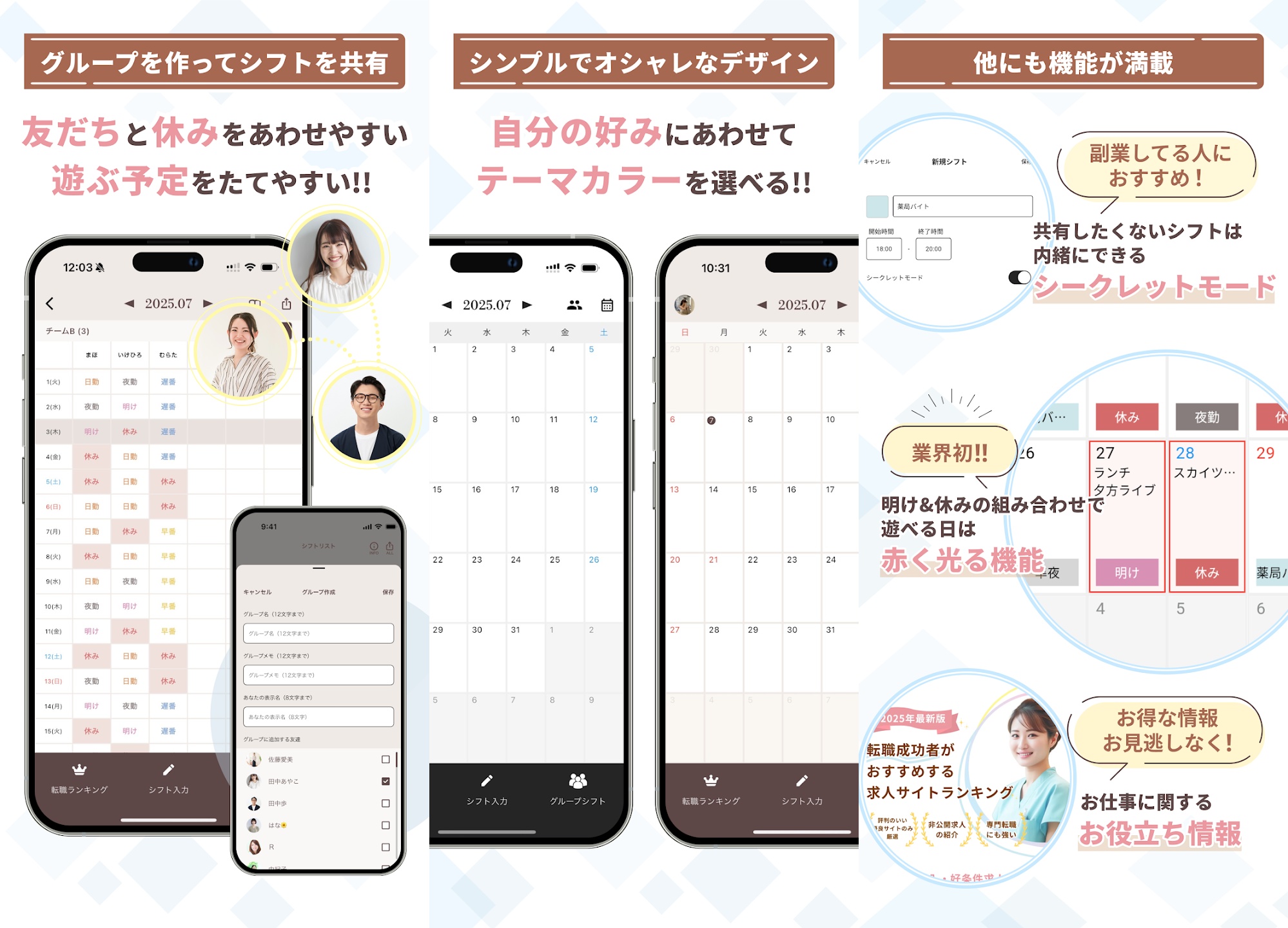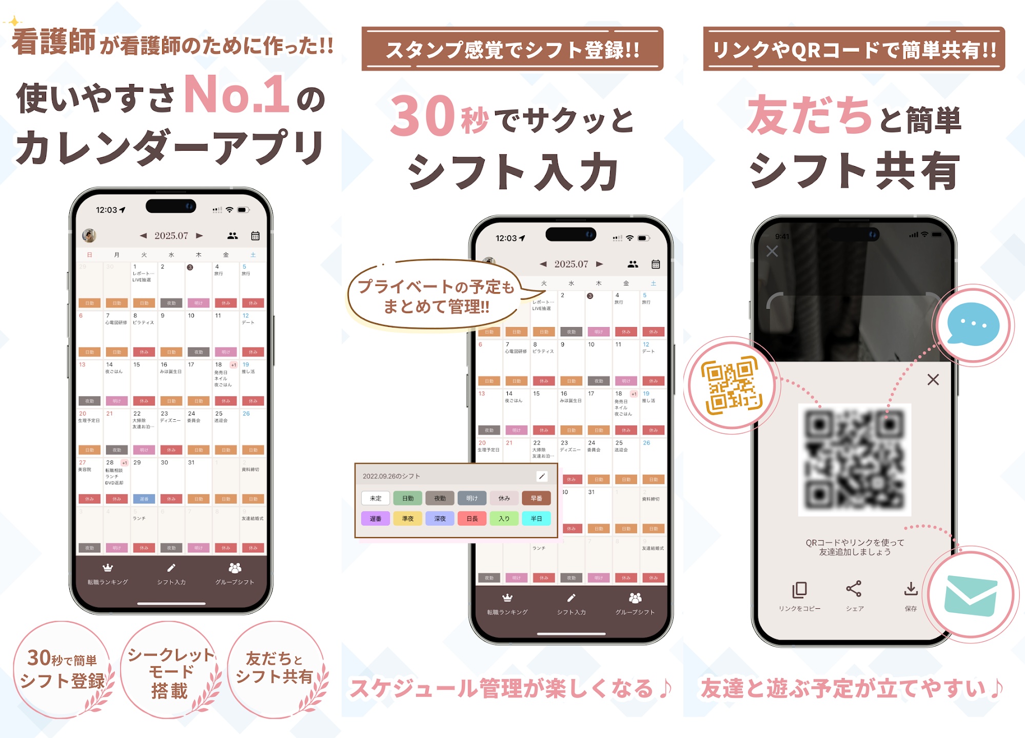 このカレンダーアプリは、看護師のシフト管理に特化した設計になっています。シフトをスタンプ感覚でサクサク入力できる操作性、友人や同僚とシフトを共有して「一緒に休める日」が一目でわかる共有機能、プライベートの予定もまとめて管理できる使いやすさが特徴です。