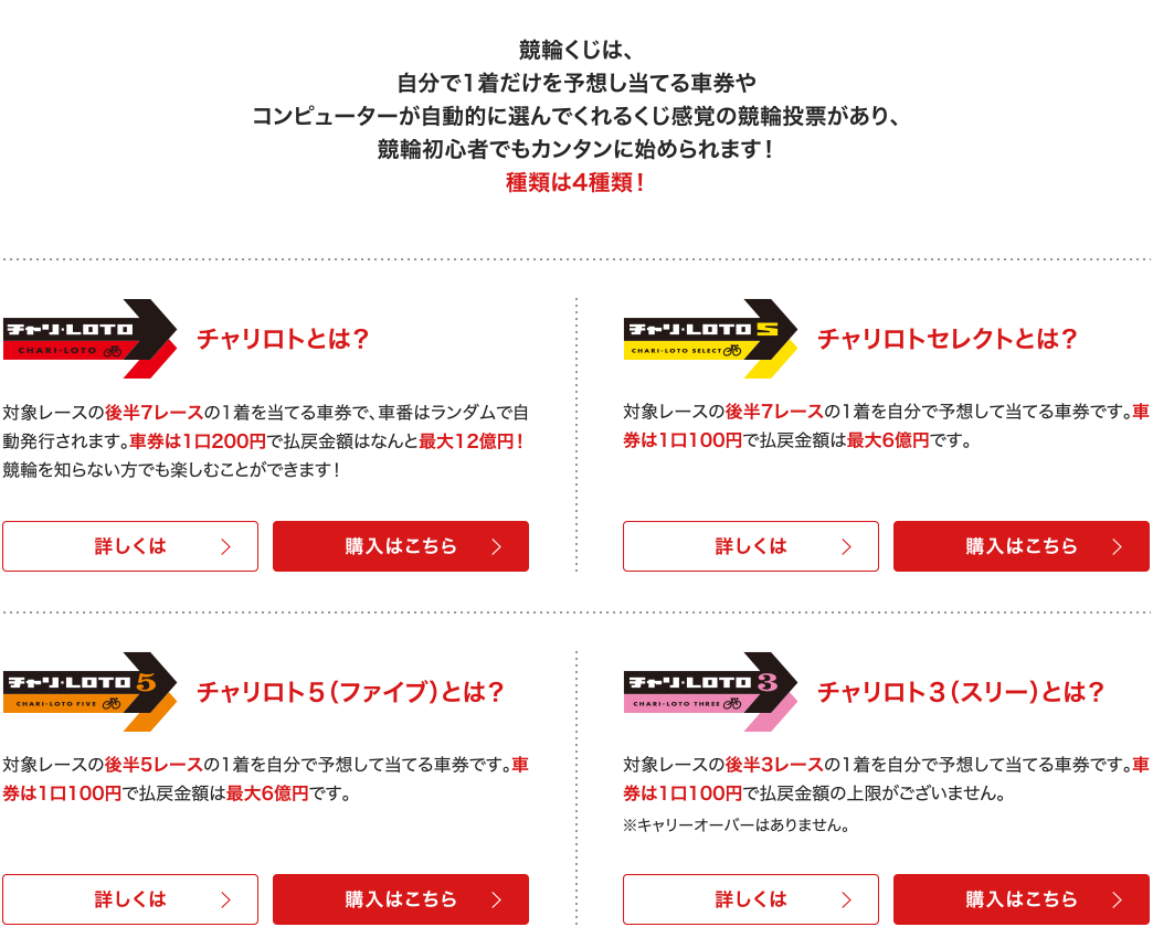 チャリロトS(セレクト)/ チャリロト5 / チャリロト3:自分で予想する方式。1口100円、最大6億円