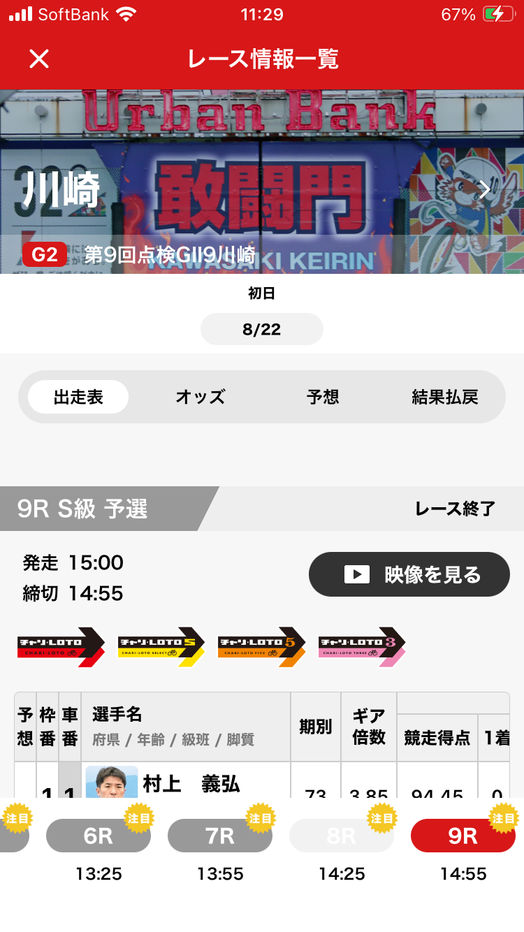 自分が購入した車券のレースをリアルタイムで観戦できるライブ映像機能も、チャリロトの魅力のひとつ。現地に行かなくてもアプリ内でレースを見ながら応援できるので、投票の臨場感がぐっと増します。