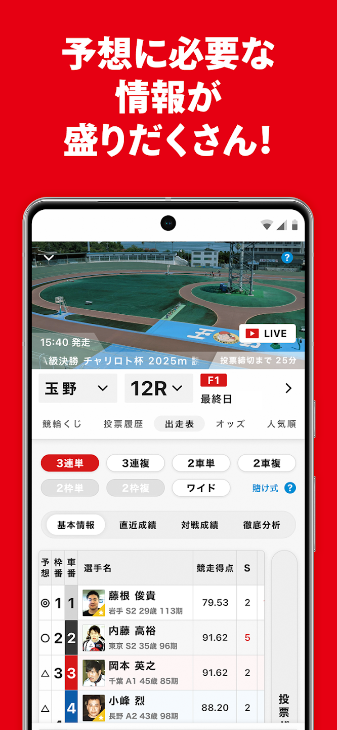 投票の精度を上げるための情報ツールも充実しています。アプリ内では出走表・リアルタイムオッズ・選手の過去成績・対戦成績(直近1年分)・徹底分析(レース種別成績・周長別成績)などを確認可能。選手の所属・年齢・競走得点・決まり手・地区割りまで一画面で把握できるため、並びの読みにも役立ちます。