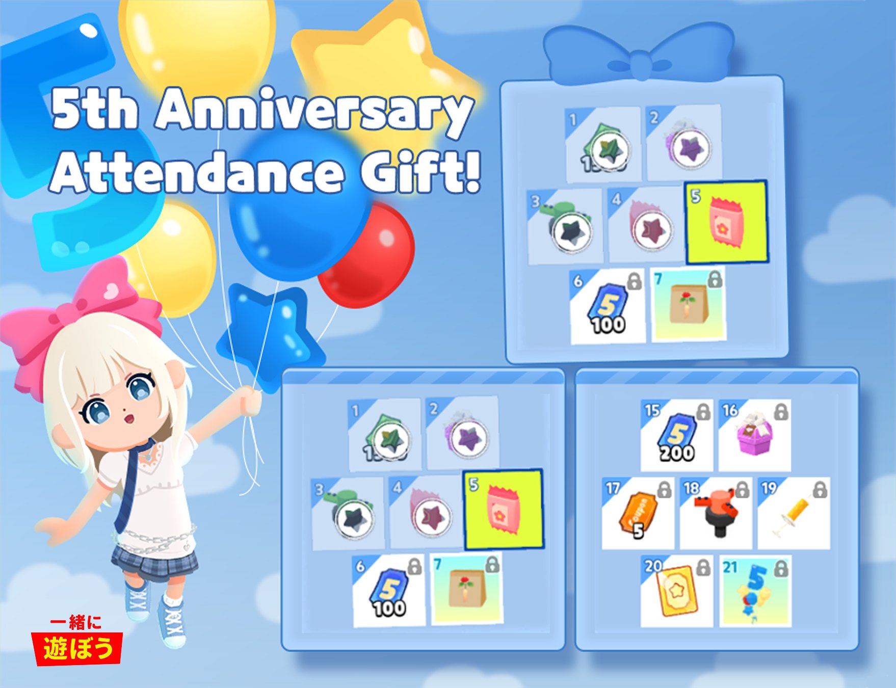 『一緒に遊ぼう』では定期的に新キャラクターや新ペットの追加、季節イベント・コラボイベントが実施されています。2026年には5周年を迎え、広場に巨大ケーキが登場するお祭りイベントが開催されました。また、人気K-POPグループTREASUREのキャラクター「TRUZ」とのコラボも実施されるなど、話題のコラボが続いています。最新情報は公式Xで随時更新されているので、見逃したくない方はフォローしておくのがおすすめです♪