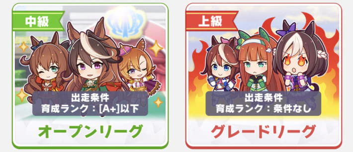 参加は「オープンリーグ(UE以下のウマ娘向け・初心者OK)」と「グレードリーグ(上限なし・強豪ひしめく)」の2種類から選択。予選ラウンドを勝ち抜いて決勝進出を目指す形式で、好成績を収めるとジュエルやガチャチケットなどの豪華報酬が手に入ります。