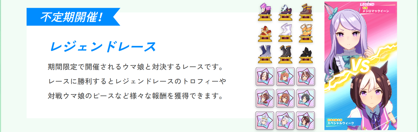 チャンミ以外にも、育成済みウマ娘を活躍させる場はたくさん用意されています。レジェンドレースは過去の強豪NPCと対戦してピース(キャラ解放素材)を集めるコンテンツ。デイリーレースで育成ウマ娘の経験値やファン数を稼いだり、サークル(ギルド)に加入して月次のランキング報酬を狙ったりと、毎日コツコツ楽しめる仕組みが充実しています。