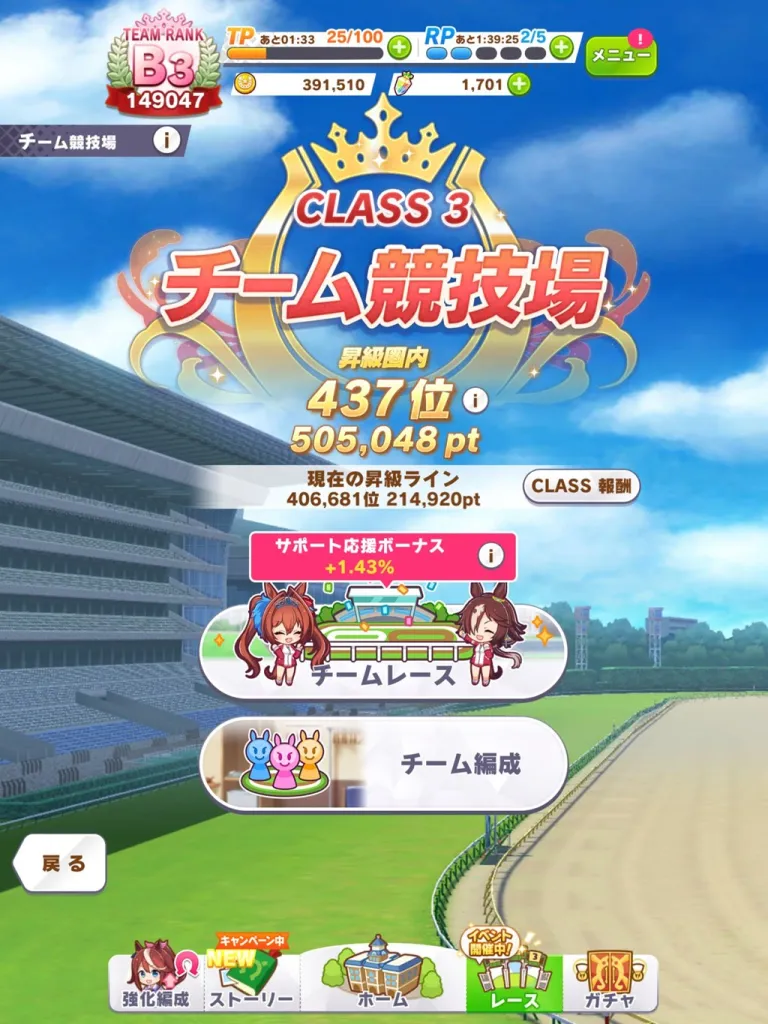 チーム競技場は、育成済みウマ娘3人でチームを組んで全国のトレーナーたちと競う常設コンテンツです。週1回ランクに応じた報酬がもらえるほか、上のランクに昇格するとジュエルも獲得できます。