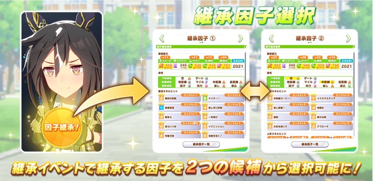 また、育成済みのウマ娘は次の育成で「継承ウマ娘(親・祖父母)」として選べます。継承することで、その子が持っていたスキルや「因子」の恩恵を受けられる仕組みです。強い因子を持つウマ娘を育てて継承させる「因子周回」は、長く遊んでいる人ほどハマる要素のひとつ。最初は意識しなくて大丈夫ですが、知ると一気に育成の幅が広がります。