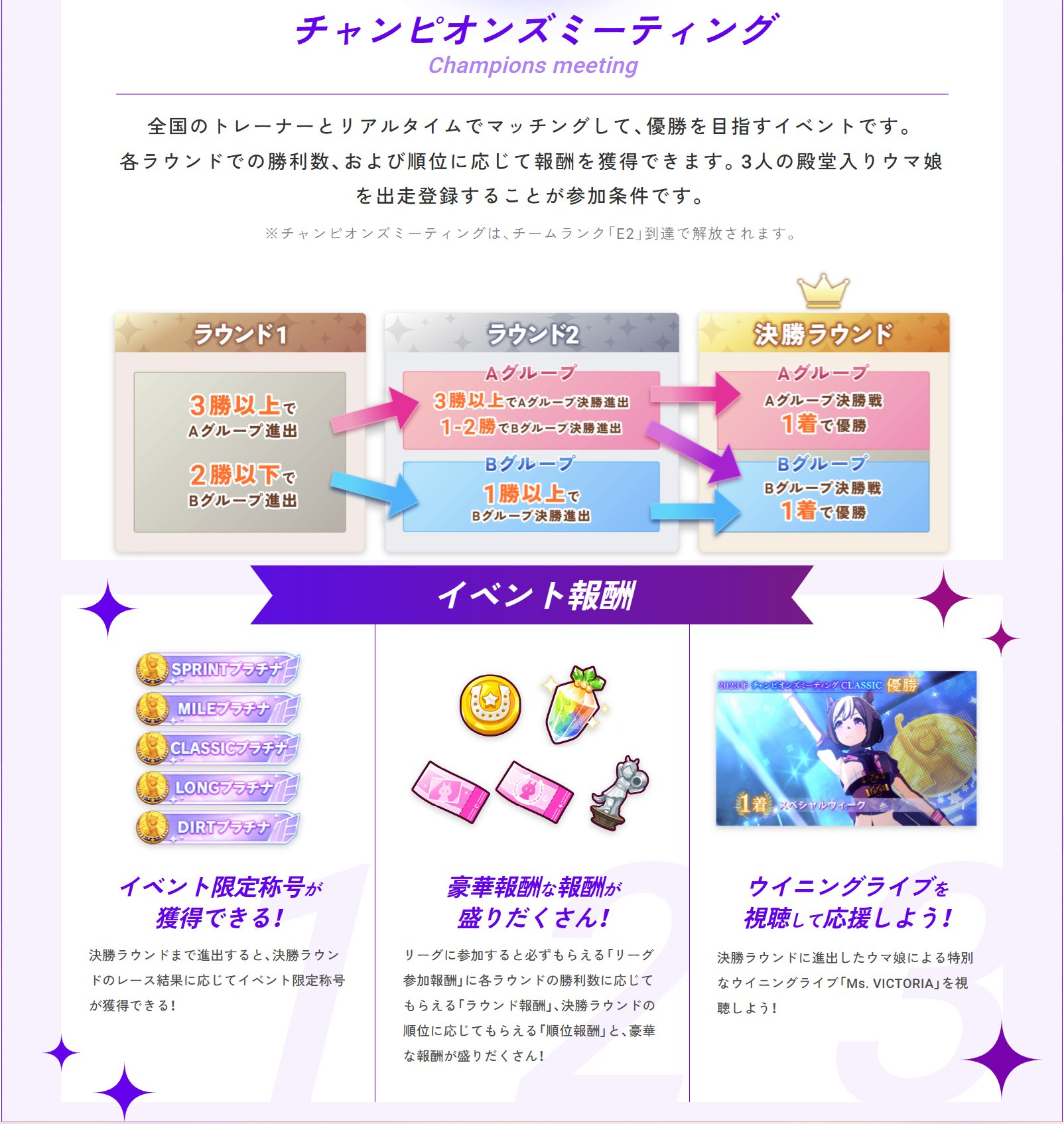 チャンピオンズミーティングは、ウマ娘の対人コンテンツの花形。リアルタイムマッチングで他のトレーナー3人(計9頭のウマ娘)でレースを行い、優勝を争うイベントです。