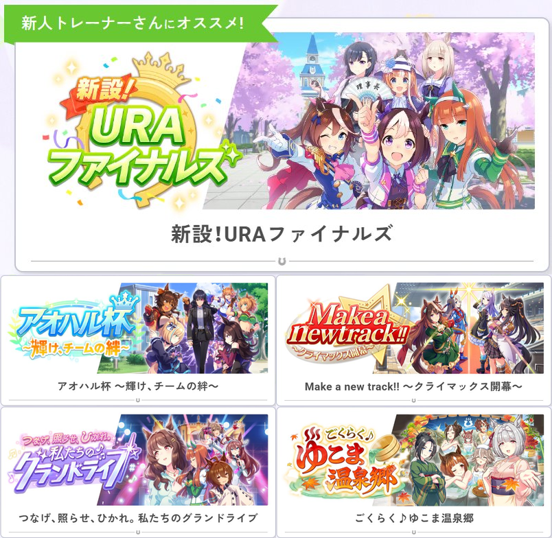 初心者はまず「URAファイナルズ」からスタートして育成の流れをつかむのがおすすめです。対人コンテンツで強いウマ娘を育てたい場合は最新シナリオの「Beyond Dreams」を狙うのが現状のセオリーになっています。シナリオは約4ヶ月ごとに新作が追加されるので、その都度最新情報をチェックしてみてください。