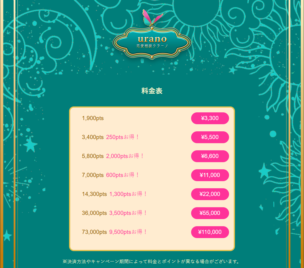 ウラーノの料金体系は、事前にポイントを購入してチャットの文字数に応じて消費する従量課金制です。1ポイント=約2円が目安で、10文字ごとにポイントが消費される仕組み。電話占いのような「1分いくら」ではないため、時間を気にせず自分のペースで会話できます。