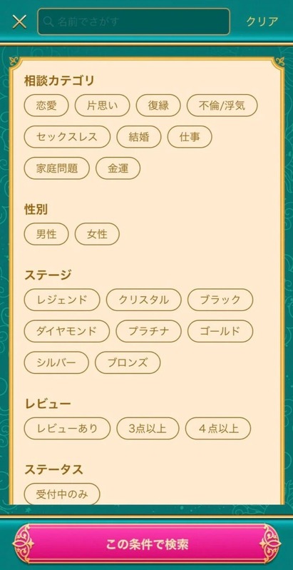アプリ上部の虫眼鏡アイコンから検索画面を開くと、以下の条件で占い師を絞り込めます。