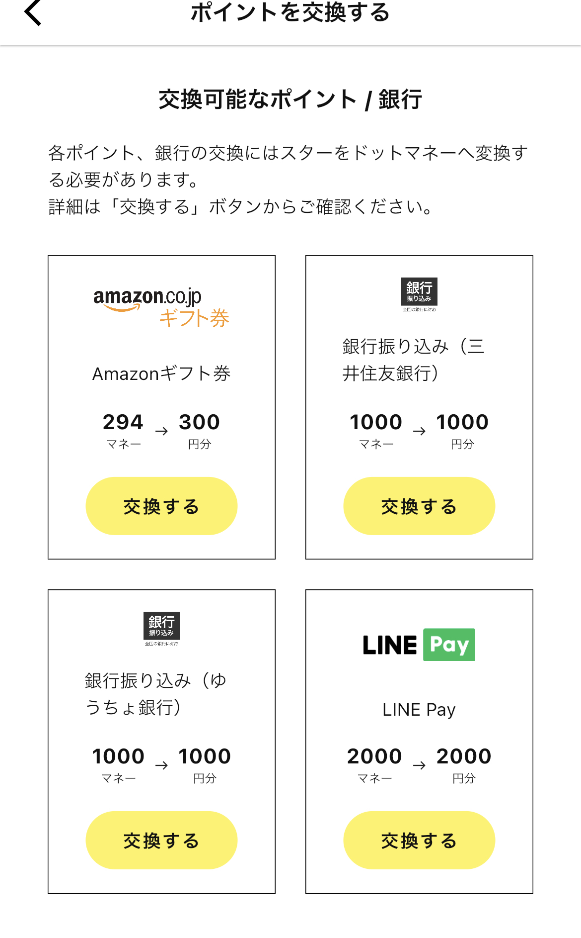 300スター以上貯まると「ドットマネー」に変換でき、銀行振込(三井住友銀行・ゆうちょ)などで現金化が可能。スターに有効期限はありませんが、退会すると消滅する点は注意が必要です。