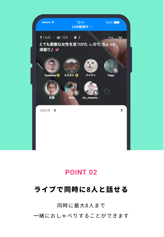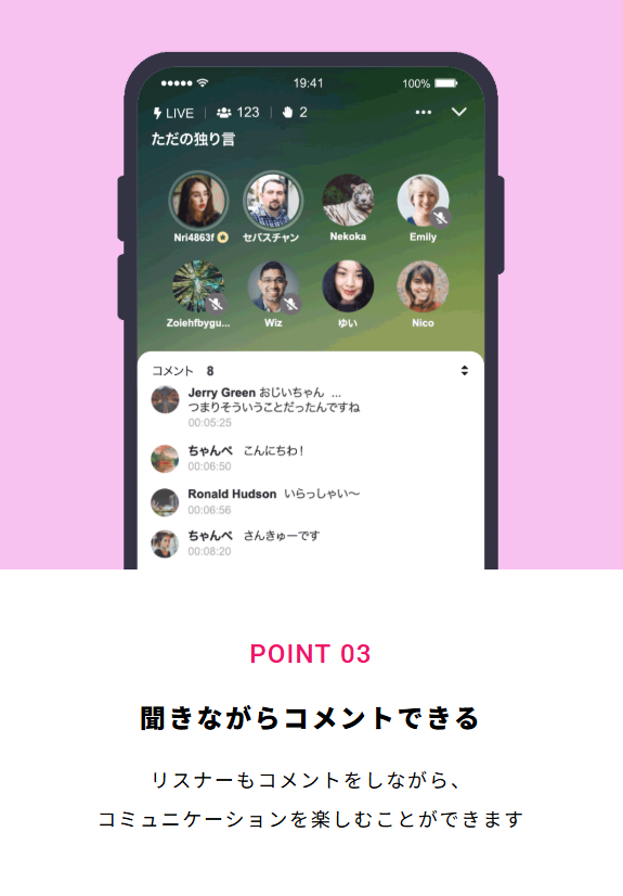 最大8人まで同時に声で参加できるので、配信者とリスナーの1対多という関係ではなく、みんなでわいわい話せる「溜まり場」のような空間が生まれます。「友達の話を聞いてる感じ」「友達と電話しているような居心地の良さ」という口コミが多いのも、この機能があるからこそ。