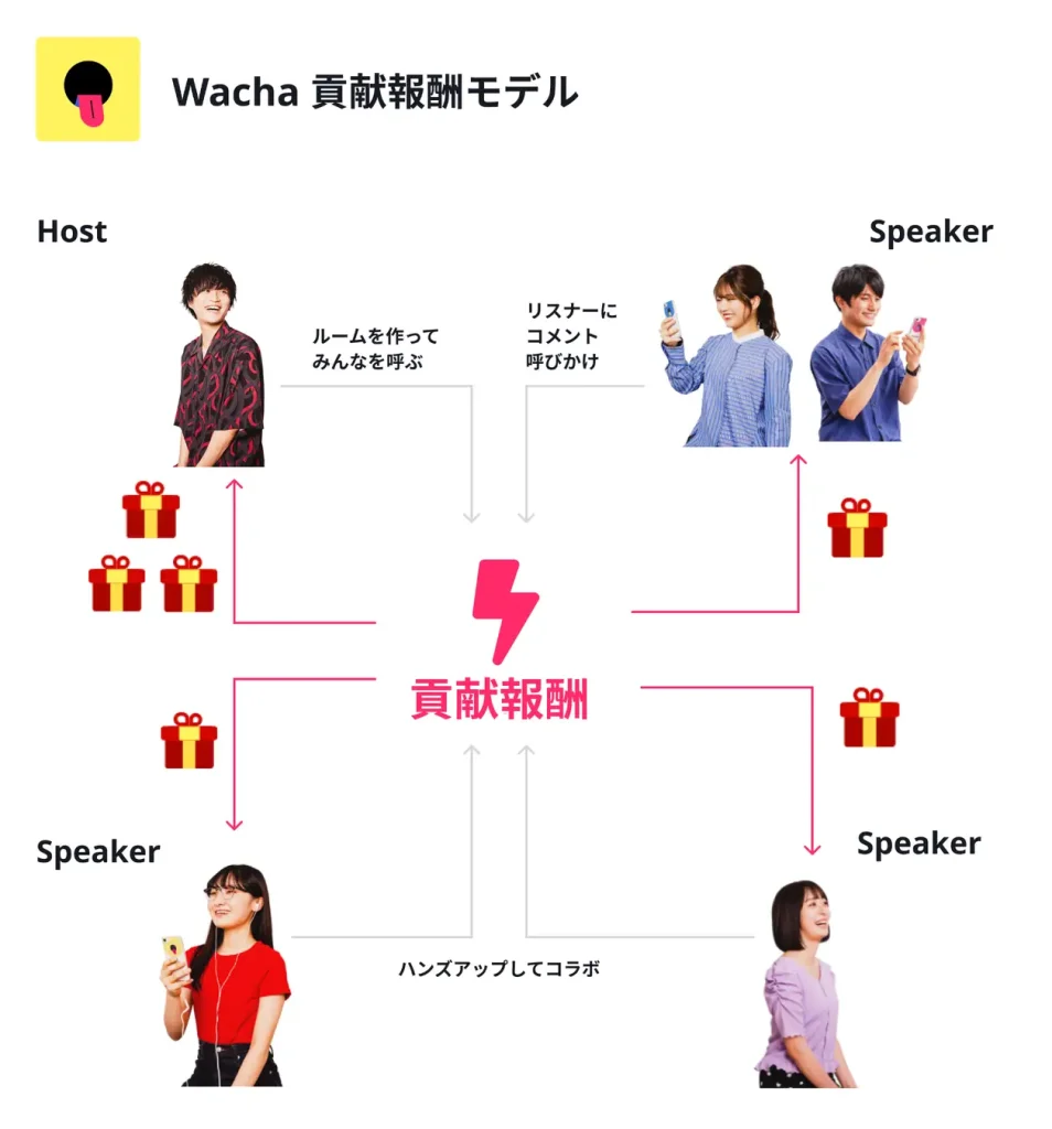 Wachaには、スピーカーとして参加したユーザーにも報酬が分配される「貢献報酬システム」があります。これはWachaが独自のアルゴリズムで算出した「盛り上がり指数」に基づき、ホストだけでなく配信を盛り上げたスピーカーにもギフトの報酬を分ける仕組みで、2022年9月に特許出願が完了しています。