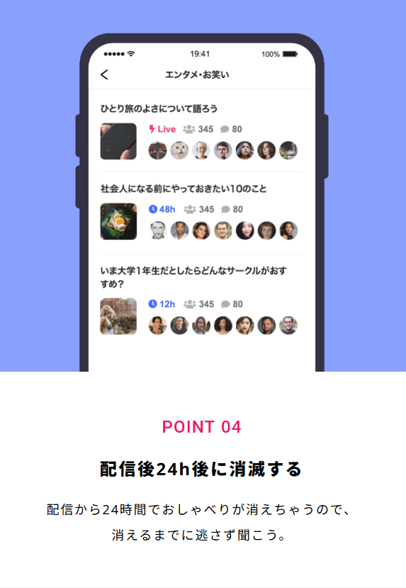 また、配信後48時間でアーカイブが自動削除される点も独自の設計。記録が残り続けるプレッシャーがないからこそ、配信者もリスナーも気軽に話せる雰囲気が生まれています。